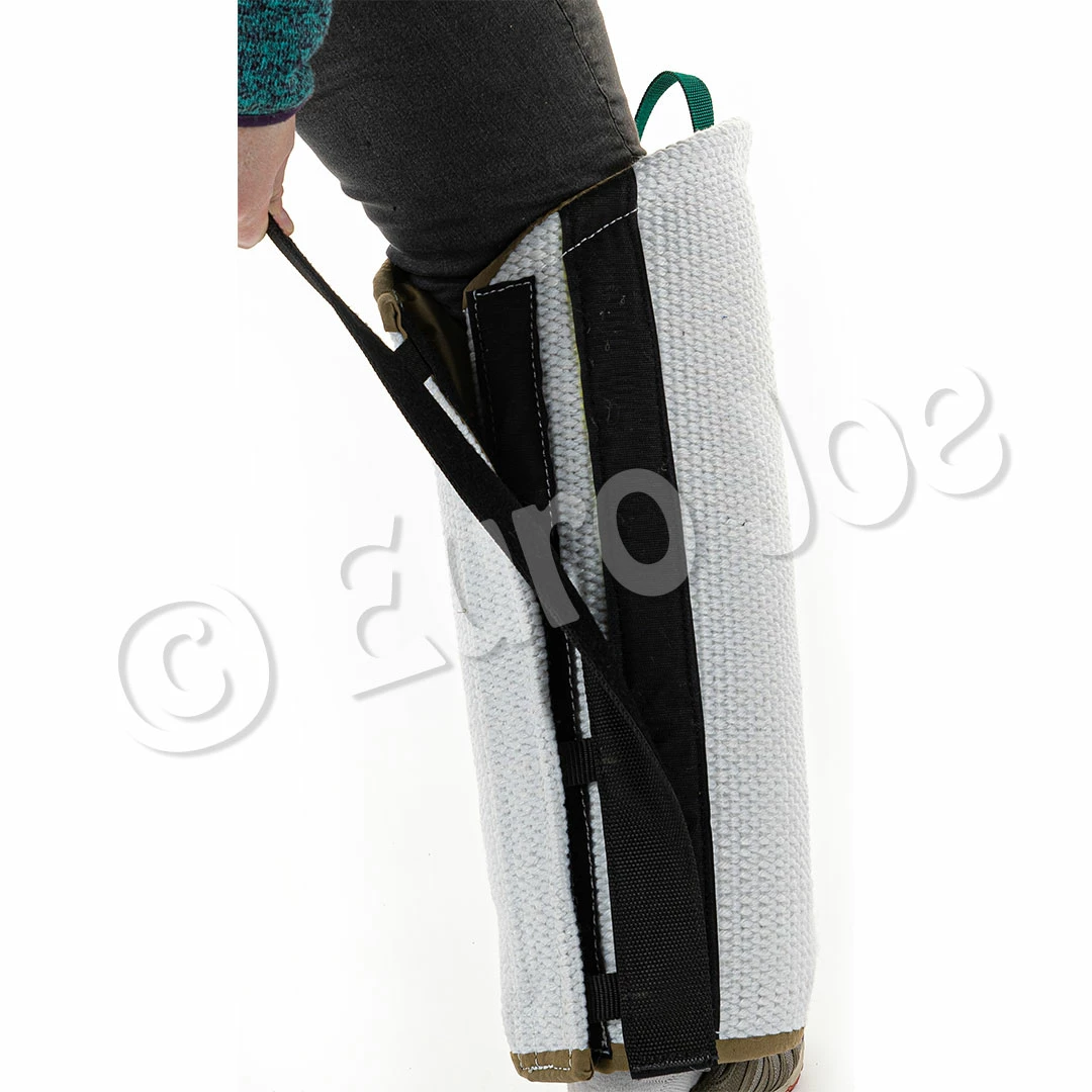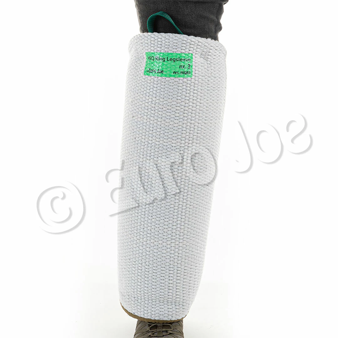 The nr. 3 legsleeve in white heavy woven fabric with velcro closure is a lightweight leg sleeve suitable for puppies and young dogs, which do already know well how to bite. Because of the big volume, the pup learns to open its mouth, but once the pup is biting, he will “gain” through the high compressing effect of the soft padding and become even stronger !