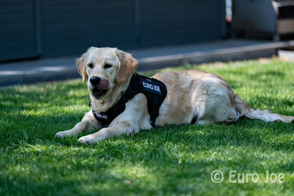 The Malinois “Keppe” wears a Large, the Golden Retriever puppy “Bee” (6 months), wears a Medium.