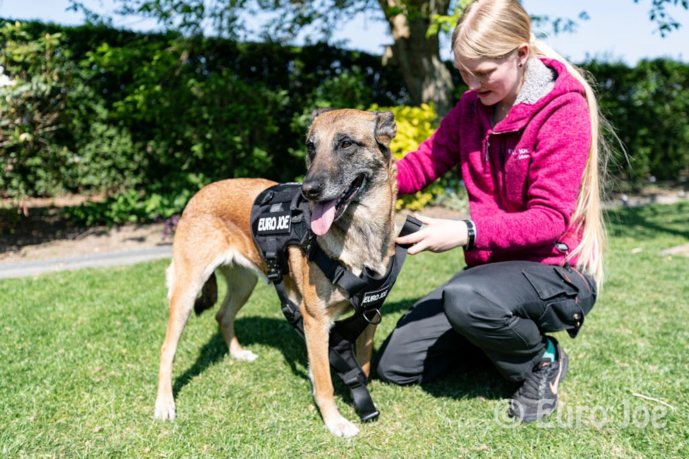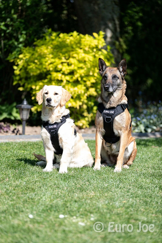 The Malinois “Keppe” wears a Large, the Golden Retriever puppy “Bee” (6 months), wears a Medium.