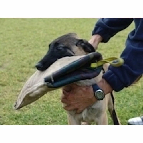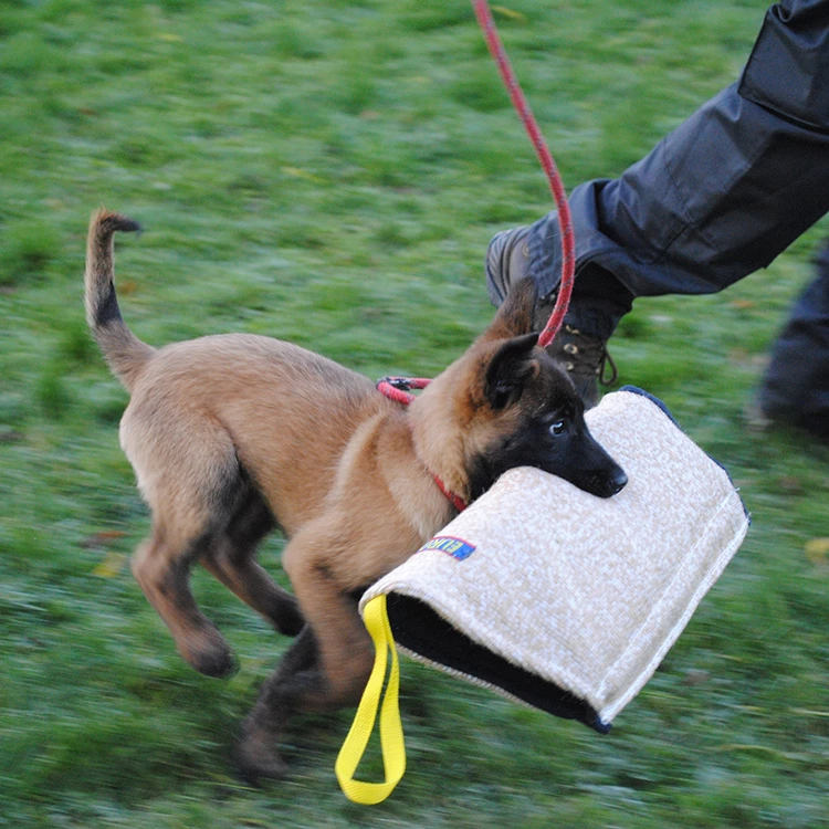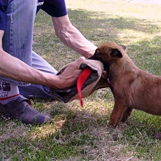 Sleeve for young puppies ; teaches the puppy to open the mouth, but allows the pup to “win” on this very soft sleeve. Easy to carry around.